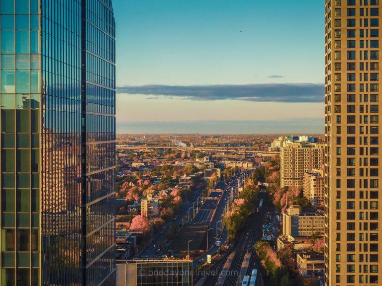 Here we are in our spacious room located on the 32nd floor. We are taken by the impressive view from the window on the St. Lawrence River. Moreover, the large window is rounded, which opens the field of vision. We almost feel like we are levitating above the city. An unforgettable view!